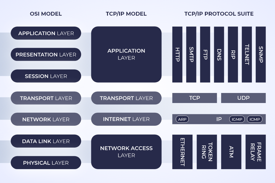 - OSI Model: Not tied to specific protocols, but examples include HTTP (Application), SSL/TLS (Presentation), TCP (Transport), IP (Network), Ethernet (Data Link)