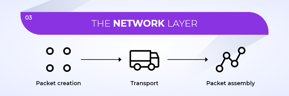 The network layer is responsible for facilitating data transfer between two different networks. If the two devices communicating are on the same network, then the network layer is unnecessary. The network layer breaks up segments from the transport layer into smaller units, called packets, on the sender’s device, and reassembling these packets on the receiving device. The network layer also finds the best physical path for the data to reach its destination; this is known as routing.