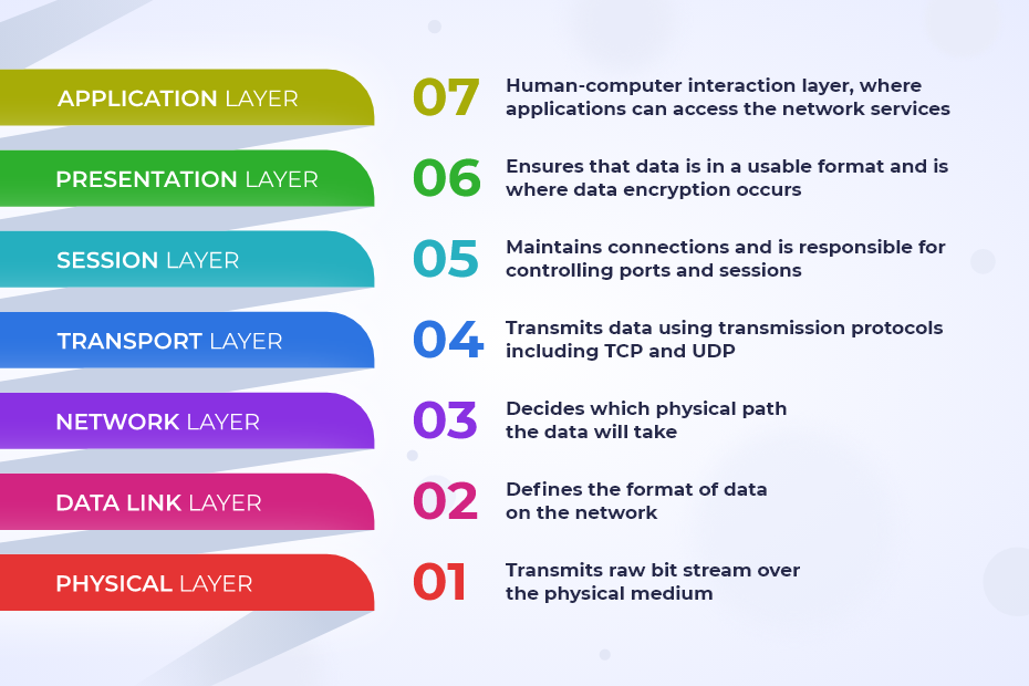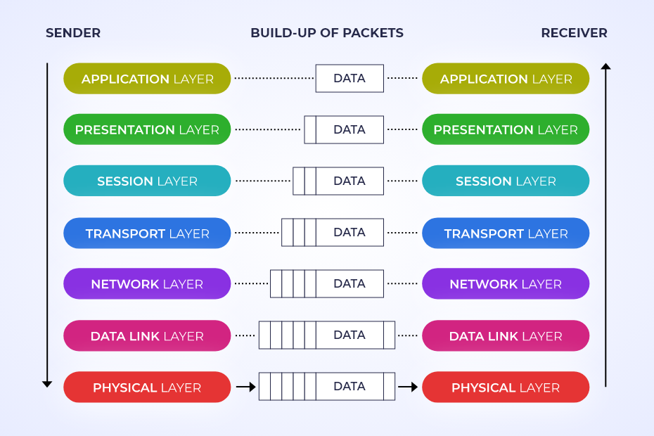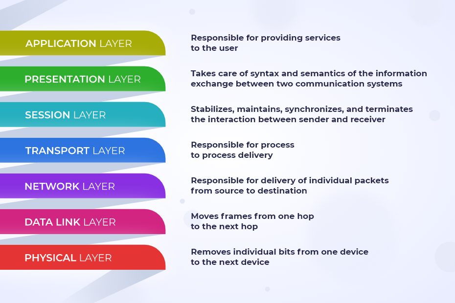 As we already explained, OSI stands for Open Systems Interconnection. It has 7 layers: the physical layer, the data link layer, the network layer, the transport layer, the session layer, the presentation layer, and the application layer. Each layer performs its task independently. It was developed in 1984 by the International Organization for Standardization (ISO).